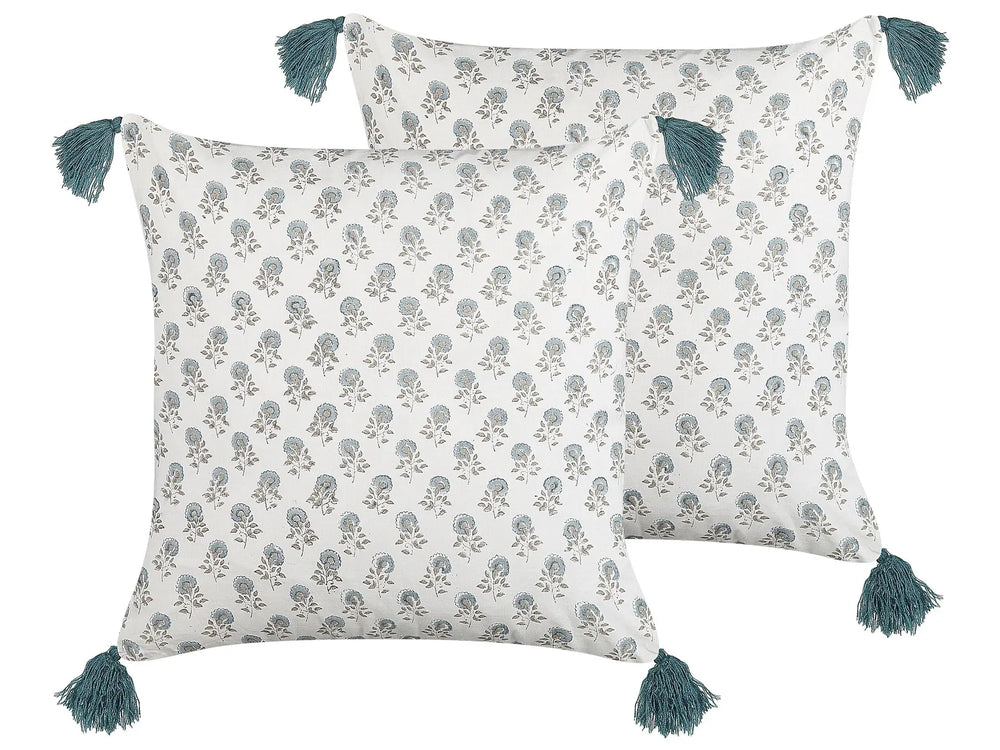 Set of 2 Scatter Cushions White and Blue Cotton 45 x 45 cm Floral Pattern Tassels Handmade Removable Cover with Filling Boho Style Beliani
