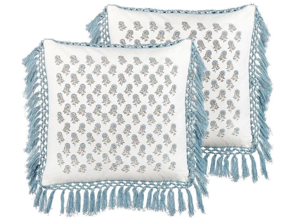 Set of 2 Scatter Cushions White and Blue Cotton 45 x 45 cm Floral Pattern Fringed Handmade Removable Cover with Filling Boho Style Beliani