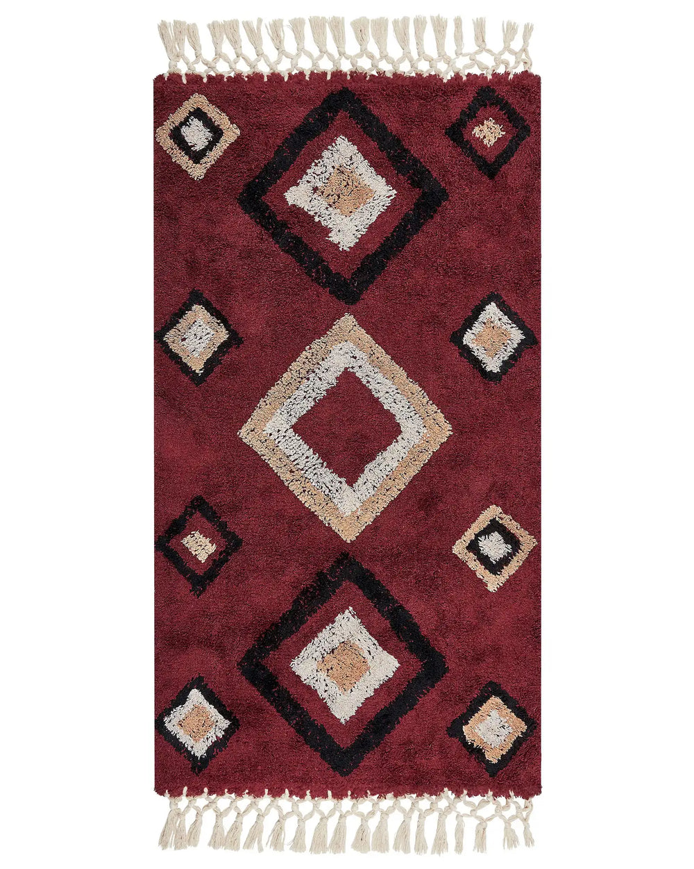 Area Rug Red Cotton 80 x 150 cm Rectangular with Tassels Diamond Pattern Boho Oriental Style Beliani