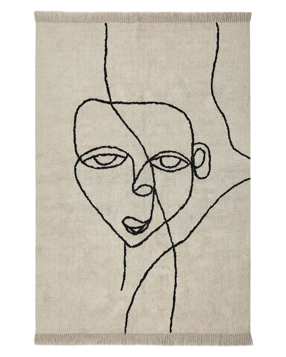 Area Rug Beige and Black Cotton 140 x 200 cm Rectangular with Tassels Face Motif Abstract Pattern Modern Boho Style Beliani