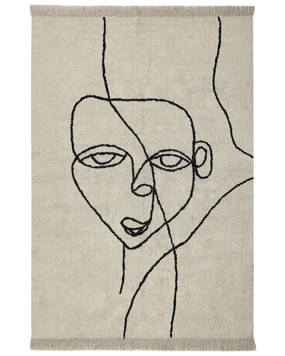 Area Rug Beige and Black Cotton 160 x 230 cm Rectangular with Tassels Face Motif Abstract Pattern Modern Boho Style Beliani