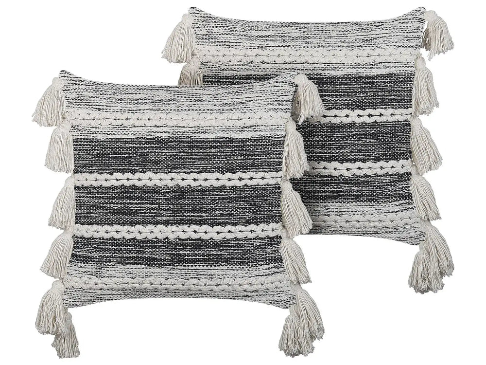 Set of 2 Decorative Cushions Black and Grey Cotton 45 x 45 cm with Tassels Boho Design Decor Accessories Beliani