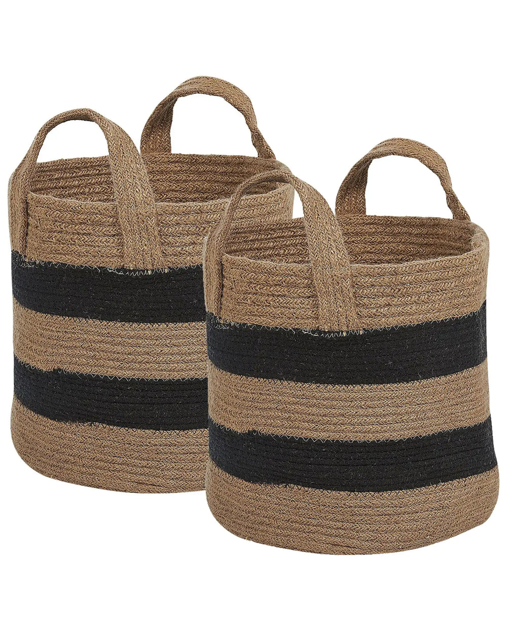 Set of 2 Storage Baskets Beige and Black Jute Striped Pattern Laundry Bins Boho Accessories Beliani