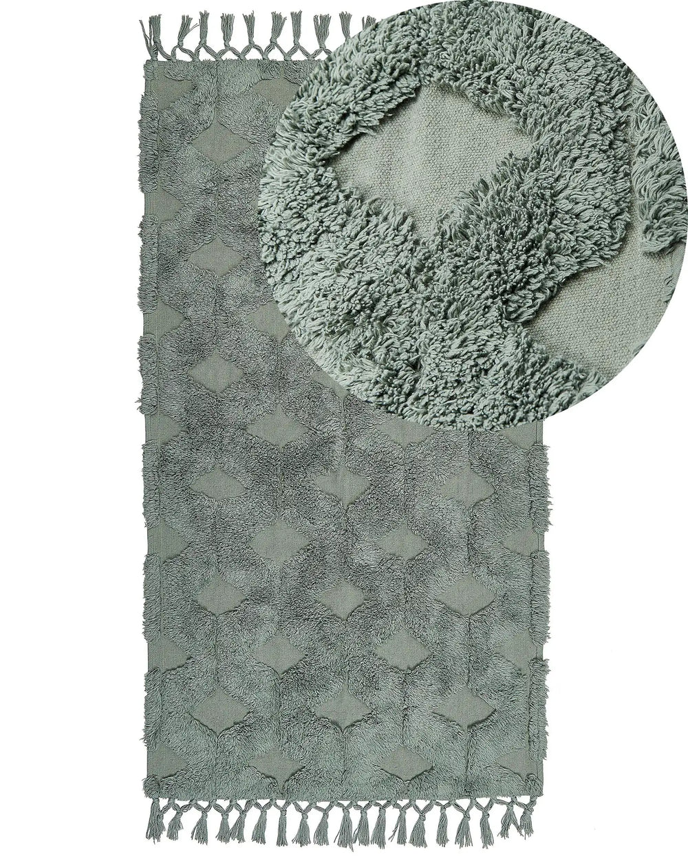 Area Rug Green Cotton 80 x 150 cm Geometric Pattern Woven Hand Tufted Shaggy with Tassels Design Living Room Bedroom Boho Beliani