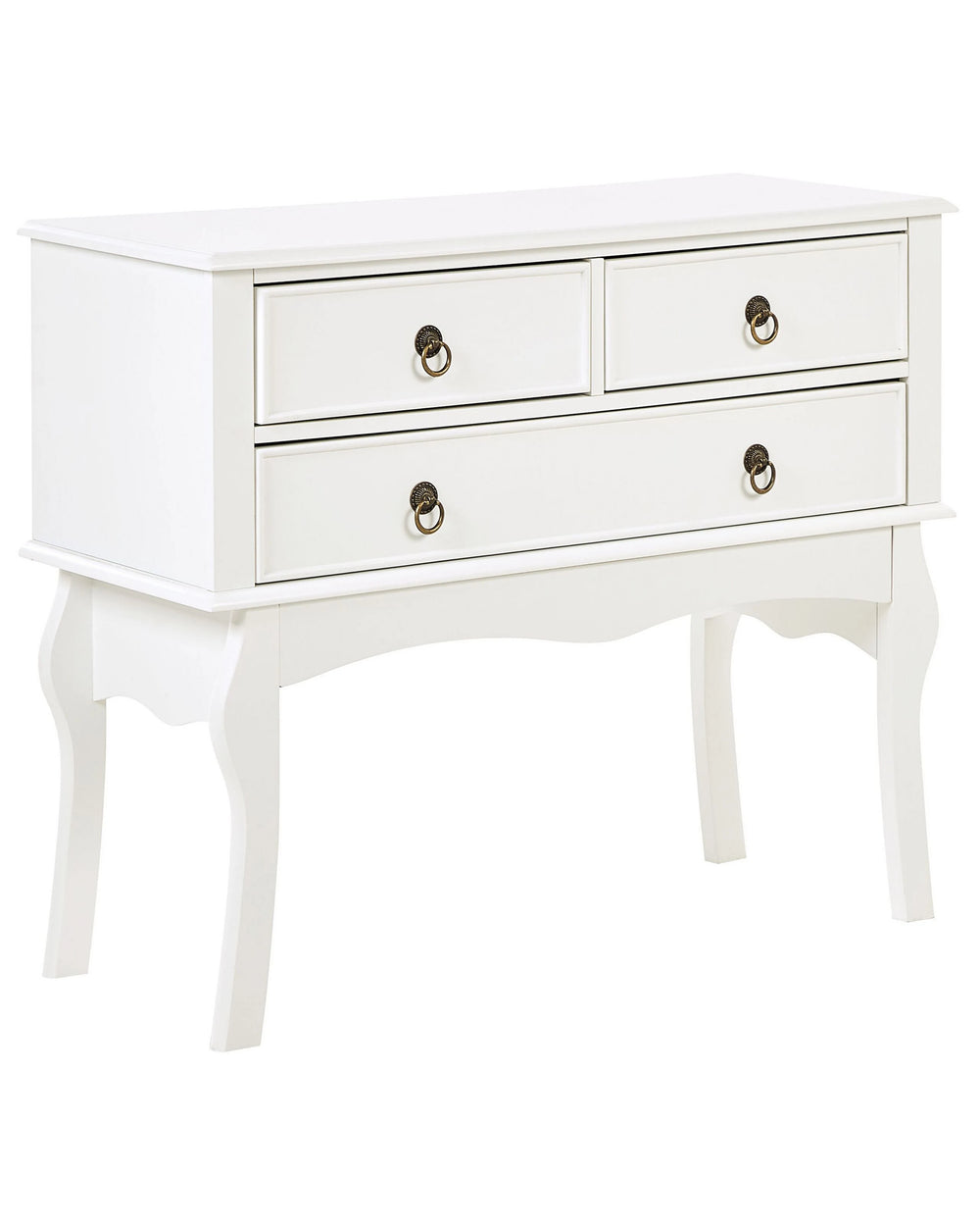 Console Table White MDF 91 x 35 x 75 cm 3 Drawers Hallway Furniture Retro Design Beliani is backordered and will ship as soon as it is back in stock.