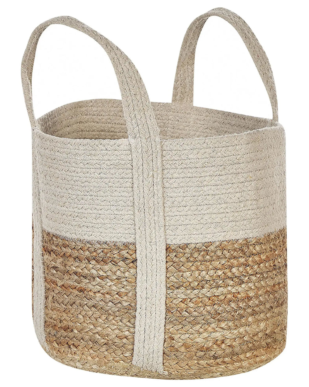 Storage Basket Beige and White Jute and Cotton Braided Laundry Hamper Fabric Bin Beliani