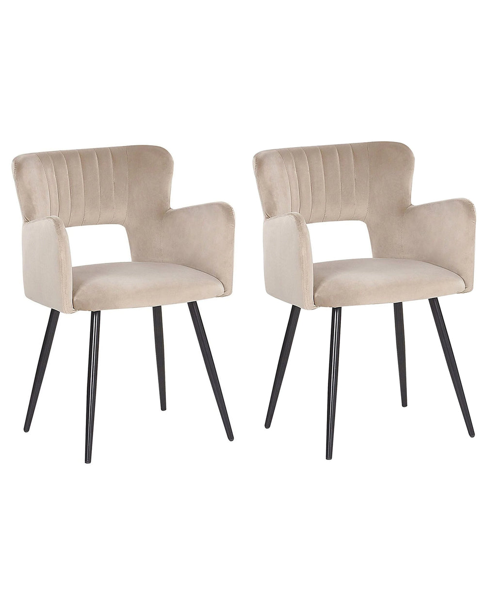 Set of 2 Chairs Dining Chair Taupe Velvet with Armrests Cut-Out Backrest Black Metal Legs Beliani is backordered and will ship as soon as it is back in stock.