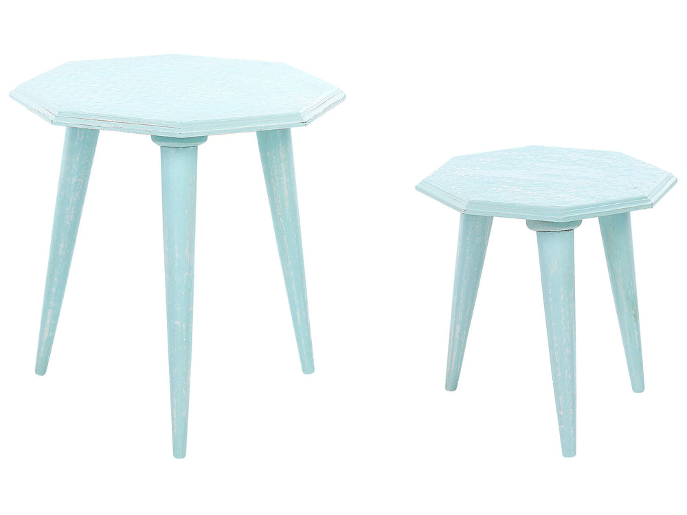 Set of 2 Nesting Side Tables Blue Distressed Mango Wood MDF Round Modern End Side Tables for Living Room Retro Vintage Design Beliani is backordered and will ship as soon as it is back in stock.
