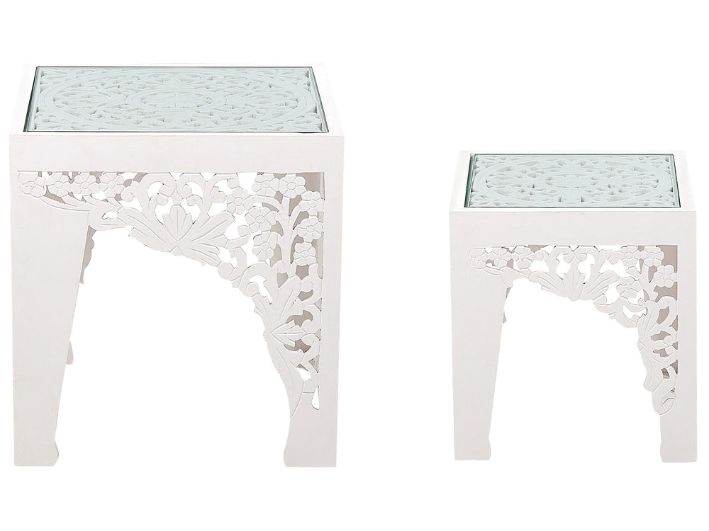 Nest of 2 Side Tables White with Carved Pattern Glass Tabletops Living Room Hallway Rustic Oriental Beliani