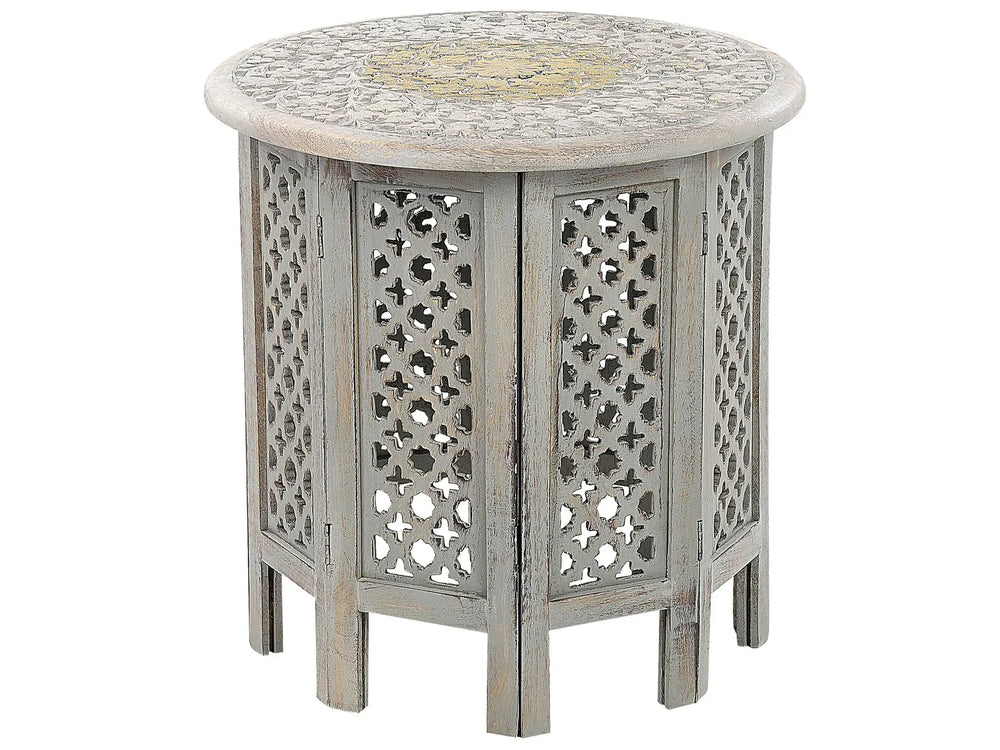 Side Table Grey Mango Wood 45 cm End Bedside Table Handmade Distressed Effect Vintage Oriental Style Openwork Design Living Room Bedroom Beliani