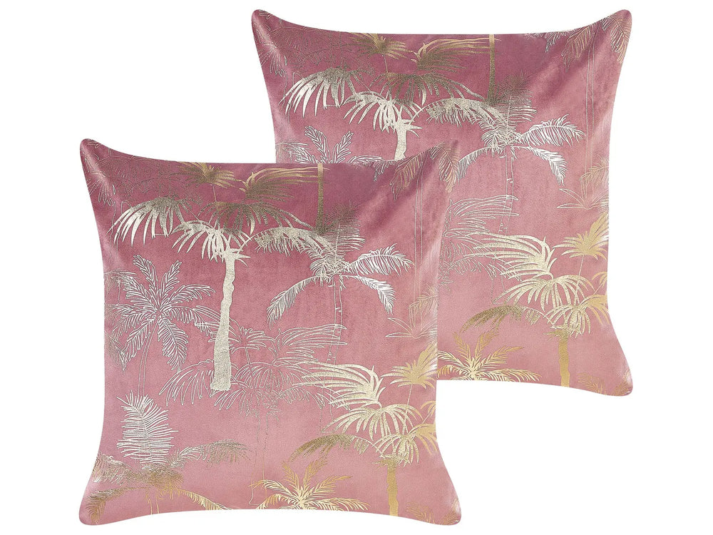 Set of 2 Pink Decorative Pillows Velvet 45 x 45 cm Palm Motif Pattern Modern Traditional Living Room Bedroom Cushions Beliani