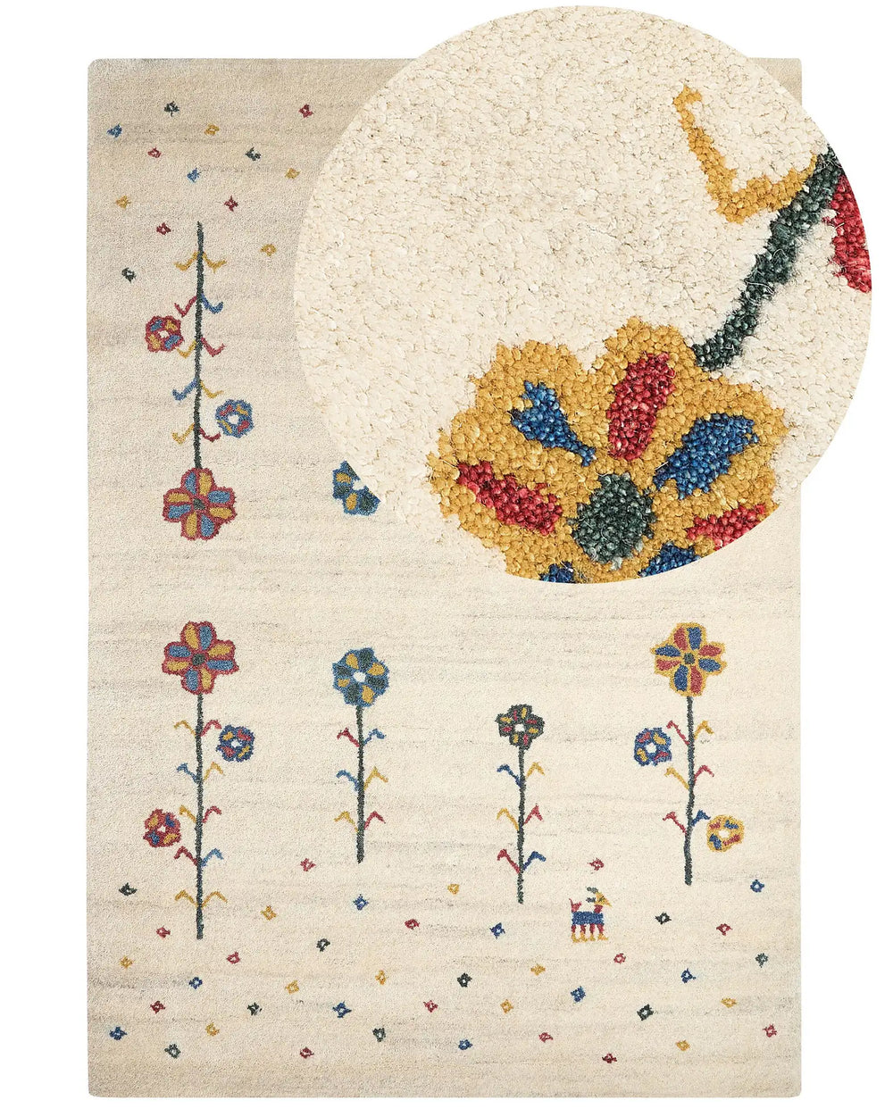Area Rug Beige Wool 140 x 200 cm Floral Pattern Animal Pattern Hand Tufted Living Room Bedroom Traditional Boho Beliani