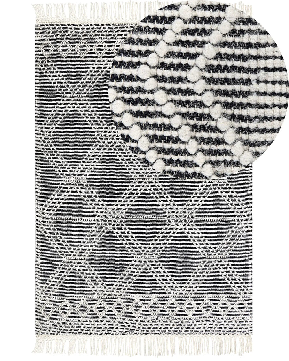Area Rug Grey and Off-White Wool Cotton 160 x 230 cm Hand Woven Flat Weave with Tassels Geometric Pattern Beliani is backordered and will ship as soon as it is back in stock.