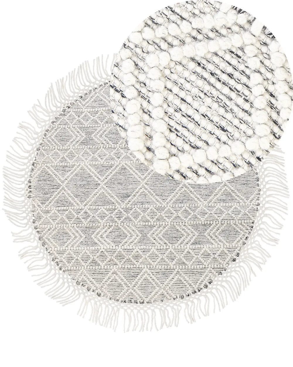 Area Rug Grey and Off-White Wool Polyester 140 cm Hand Woven Flat Weave with Tassels Geometric Pattern Beliani
