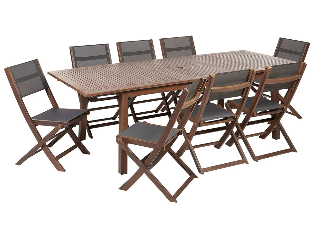 Garden Dining Set Dark Acacia Wood Grey PVC Fabric Extending Outdoor Table 8 Folding Chairs 9 Piece Furniture Set Beliani