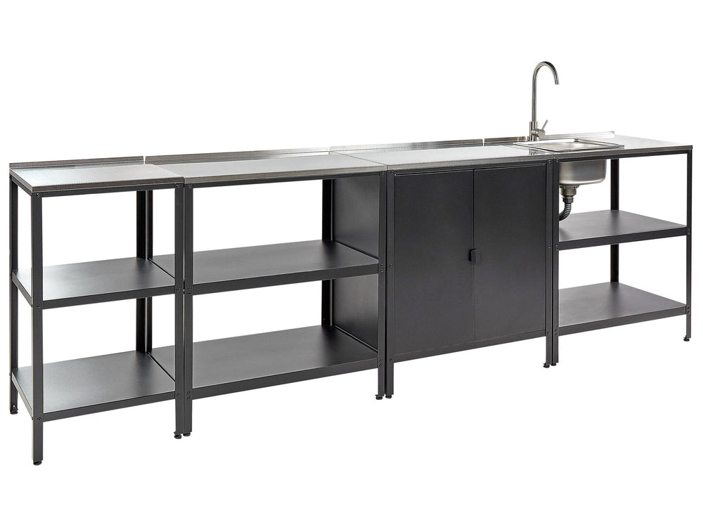 4 Piece Outdoor Kitchen Set Black Stainless Steel 3 Kitchen Storage Island and Cabinet Sink Single Lever Outdoor Kitchen Cooking Station Beliani is backordered and will ship as soon as it is back in stock.