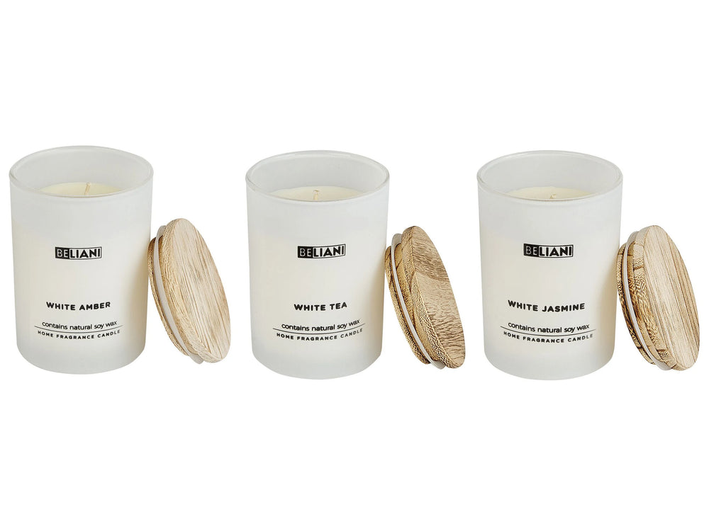 Set of 3 Scented Candles Multicolour 100% Soy Wax Cotton Wick White Glass Fragrance White Amber/White Tea/White Jasmine Beliani is backordered and will ship as soon as it is back in stock.