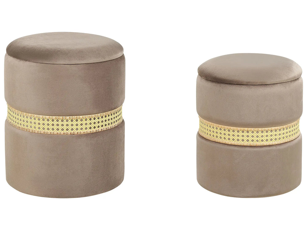 Set of 2 Pouffes Cream Taupe Velvet Rattan Bands Modern Boho Internal Storage Living Room Bedroom Beliani