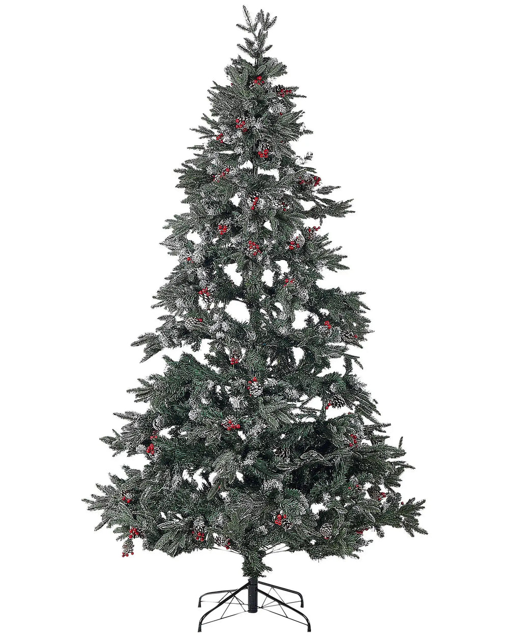 Artificial Snow Christmas Tree Green PVC Metal Base 240 cm with Pine Cones Holly Berries Frosted Branches Traditional Beliani
