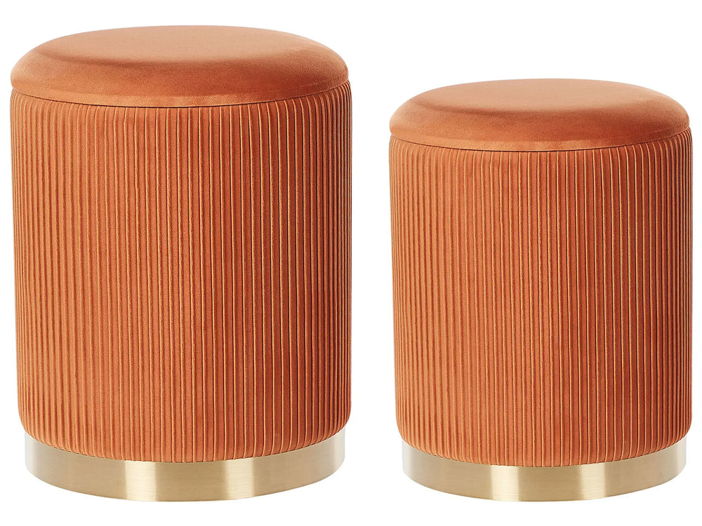 Set of 2 Storage Pouffes Orange Polyester Velvet Upholstery Gold Base Modern Design Horizontal Tuft Living Room Accent Piece Beliani is backordered and will ship as soon as it is back in stock.