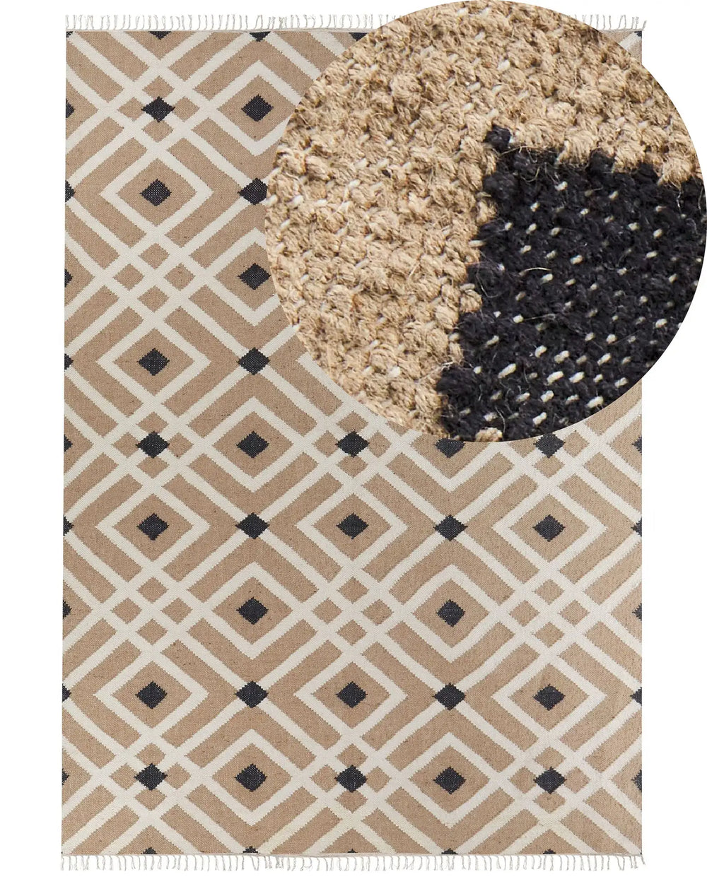 Discover this handcrafted fusion rugwhere nature meets modernity. Woven with care, this rectangular marvel blends the earthy allure of jute with a hint of cotton, creating a tactile masterpiece. The beige canvas is adorned with a captivating geometric pattern, accentuated by sleek black details. More than a rug, it's a symphony of craftsmanship and comforthandmade and floor heating-friendly, inviting warmth and style into your home.