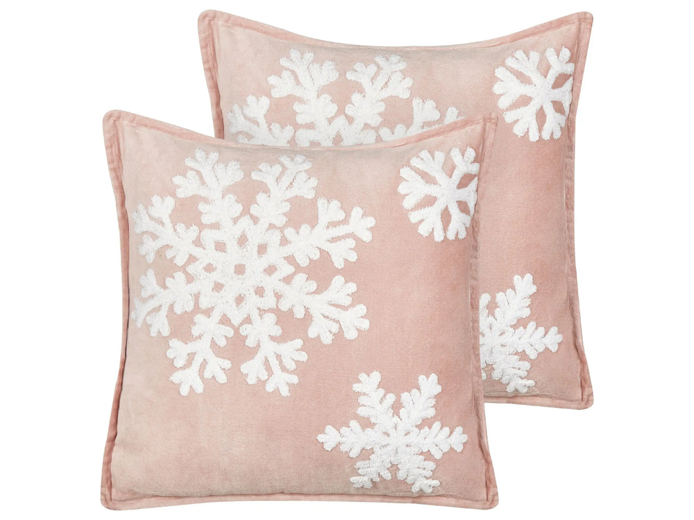 Set of 2 Scatter Cushions Pink White Cotton Velvet 45 x 45 cm Christmas Motif Snowflake Print Accessories Festive Decor Beliani