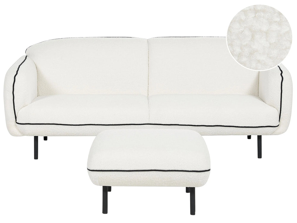 3 Seater Sofa with Ottoman White Boucle Fabric Soft Nubby Metal Legs Black Decorative Edging Retro Glam Art Decor Style Beliani is backordered and will ship as soon as it is back in stock.
