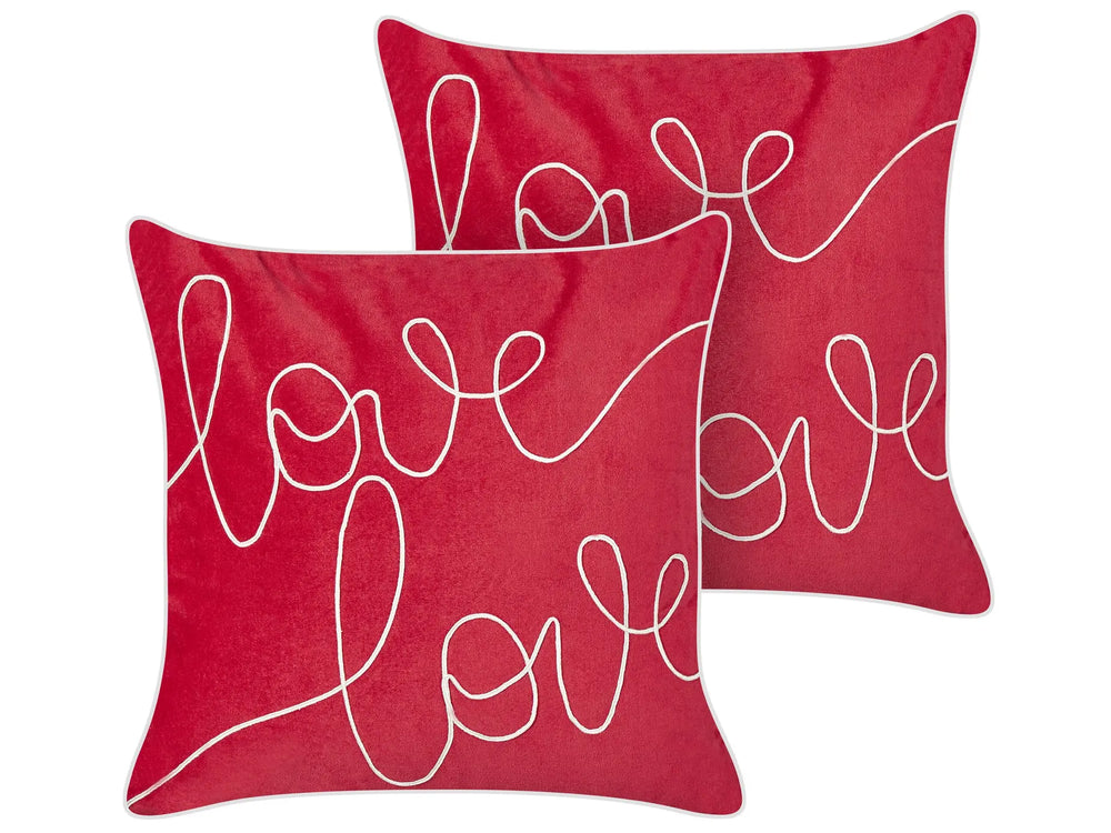 Set of 2 Scatter Cushions Red Velvet Cotton 45 x 45 cm Square Handmade Throw Pillows Embroidered Love Writing Removable Cover Beliani is backordered and will ship as soon as it is back in stock.
