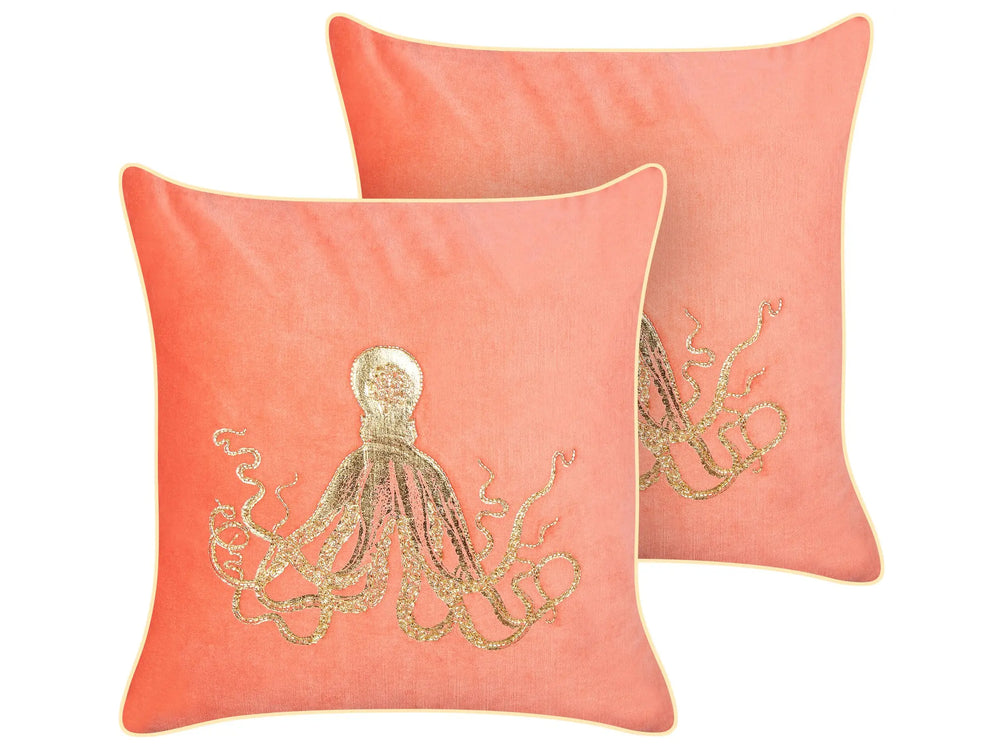 Set of 2 Scatter Cushions Red Velvet 45 x 45 cm Marine Octopus Motif Square Polyester Filling Home Accessories Beliani