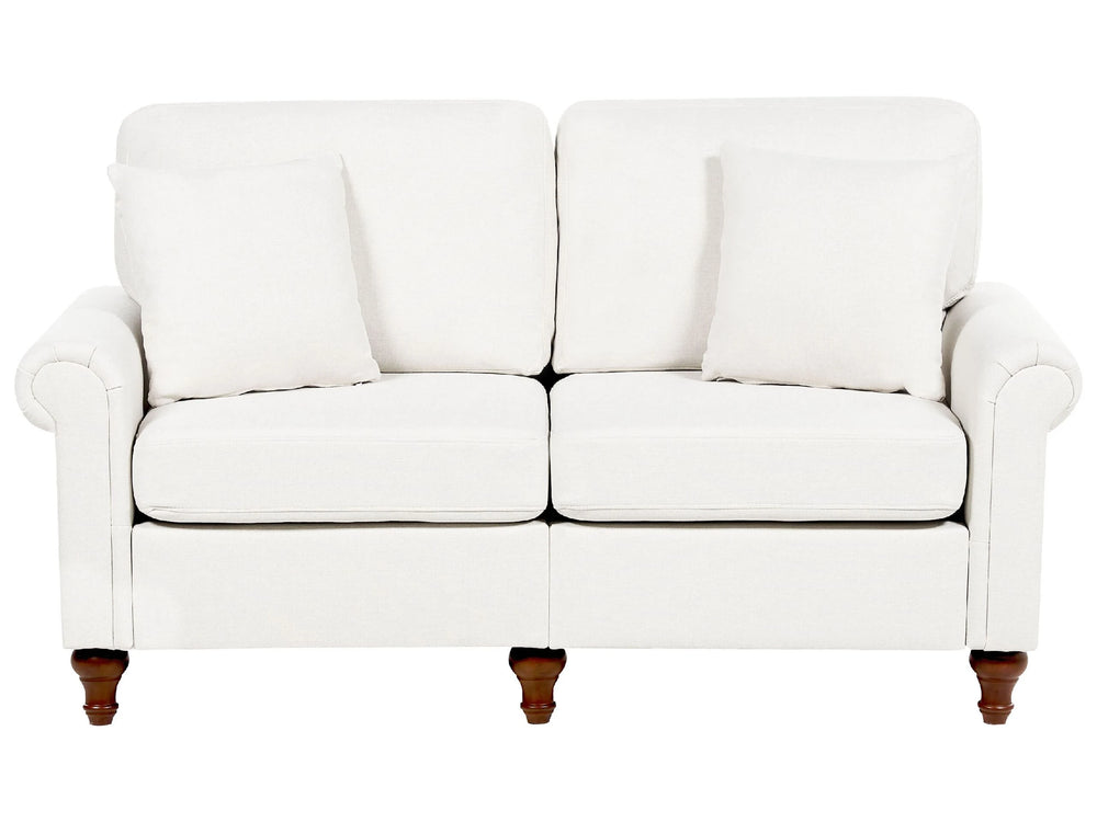 2 Seater Sofa White Fabric Upholstery Scrolled Arms Wood Frame Throw Pillows Modern Living Room Beliani