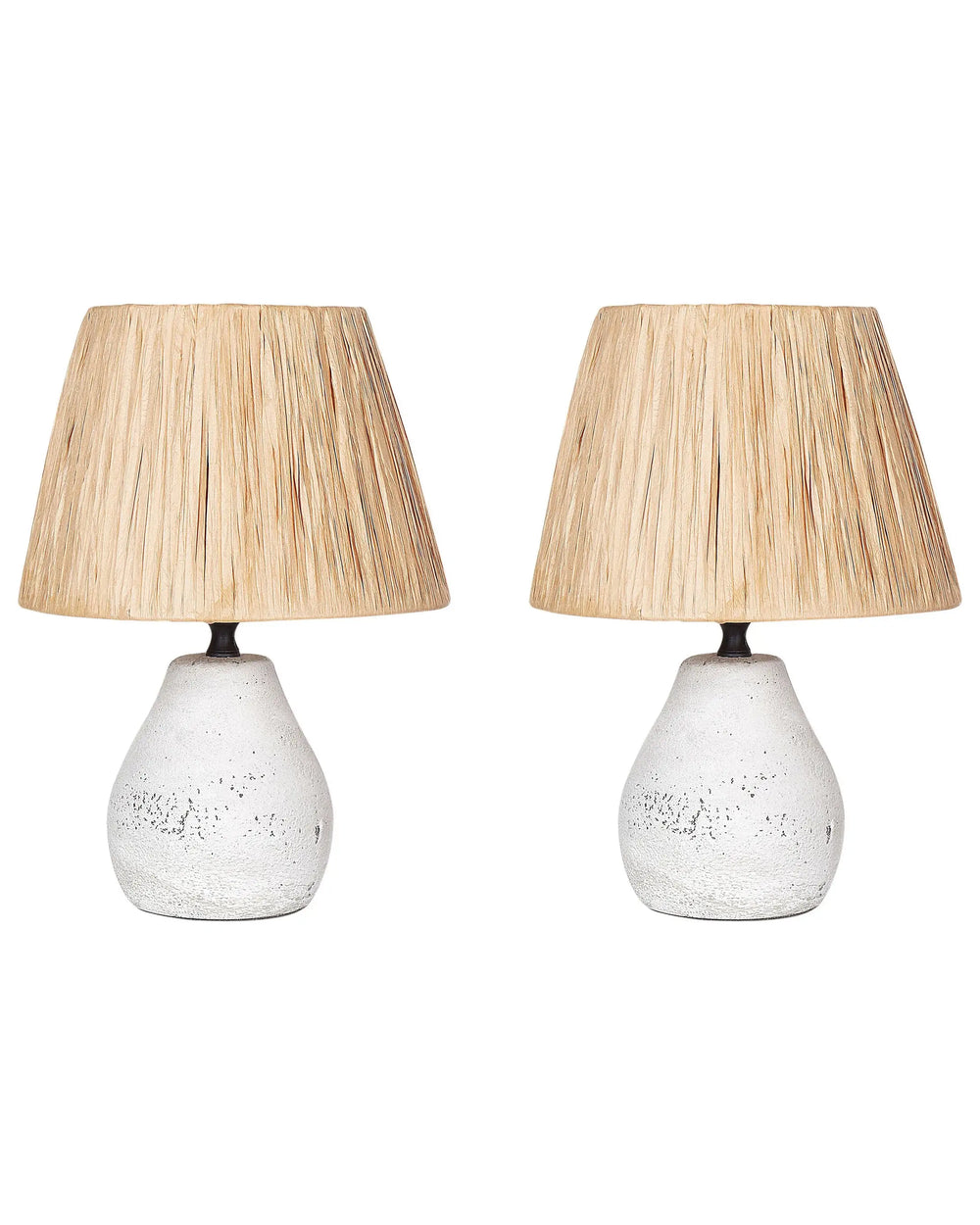 Set of 2 Table Lamps White and Natural Ceramic Paper Pulp Cone Shaped Shades Distressed Effect Minimalistic Design Beliani