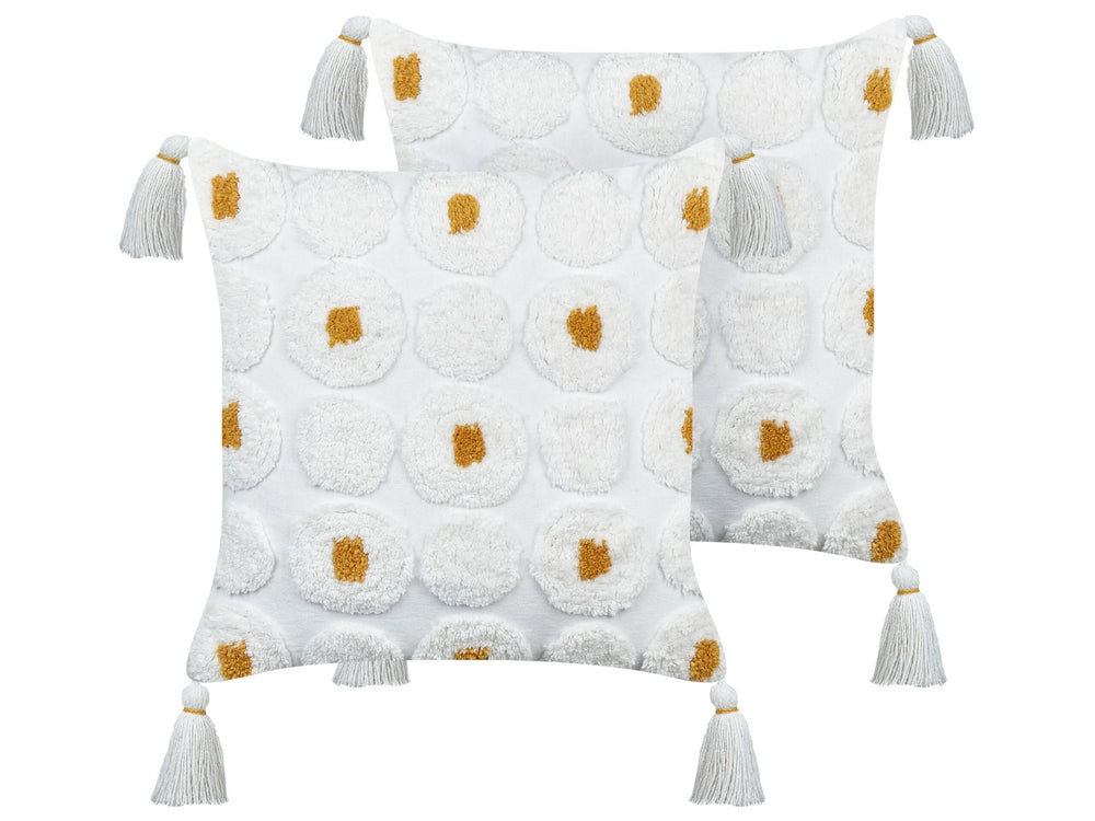 2 Decorative Cushions White Cotton 45 x 45 cm with Yellow Dots and Tassels Beliani