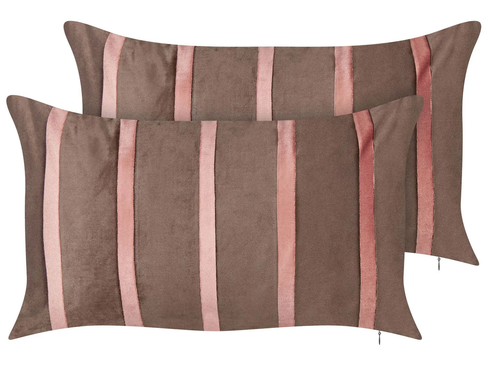 Set of 2 Scatter Cushions Brown and Pink Velvet Fabric 35 x 60 cm Striped Pattern Handmade Home Decor Accessories Beliani