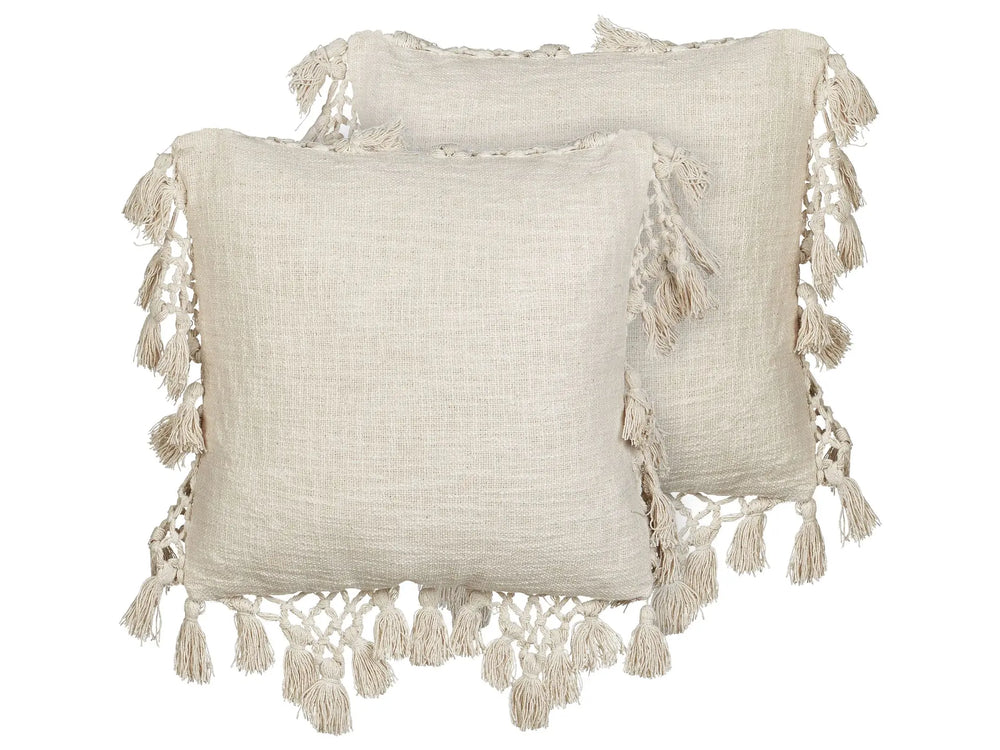 Set of 2 Scatter Cushions Beige Cotton Fabric 45 x 45 cm with Tassels Knitted Home Decor Accessories Beliani
