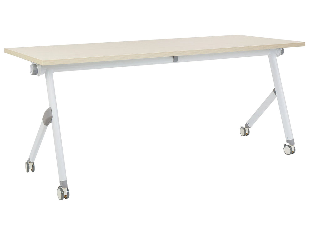 Folding Office Desk Light Wood and White Metal Frame MFC Tabletop 180 x 60 cm Foldable Portable Mobile Table with Casters Modern Design Beliani