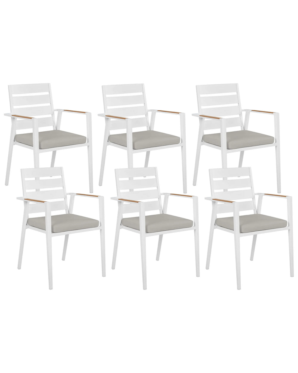 Set of 6 Garden Dining Chairs White Aluminium Frame with Grey Seat Cushions Slatted Backrest Design Modern Beliani is backordered and will ship as soon as it is back in stock.