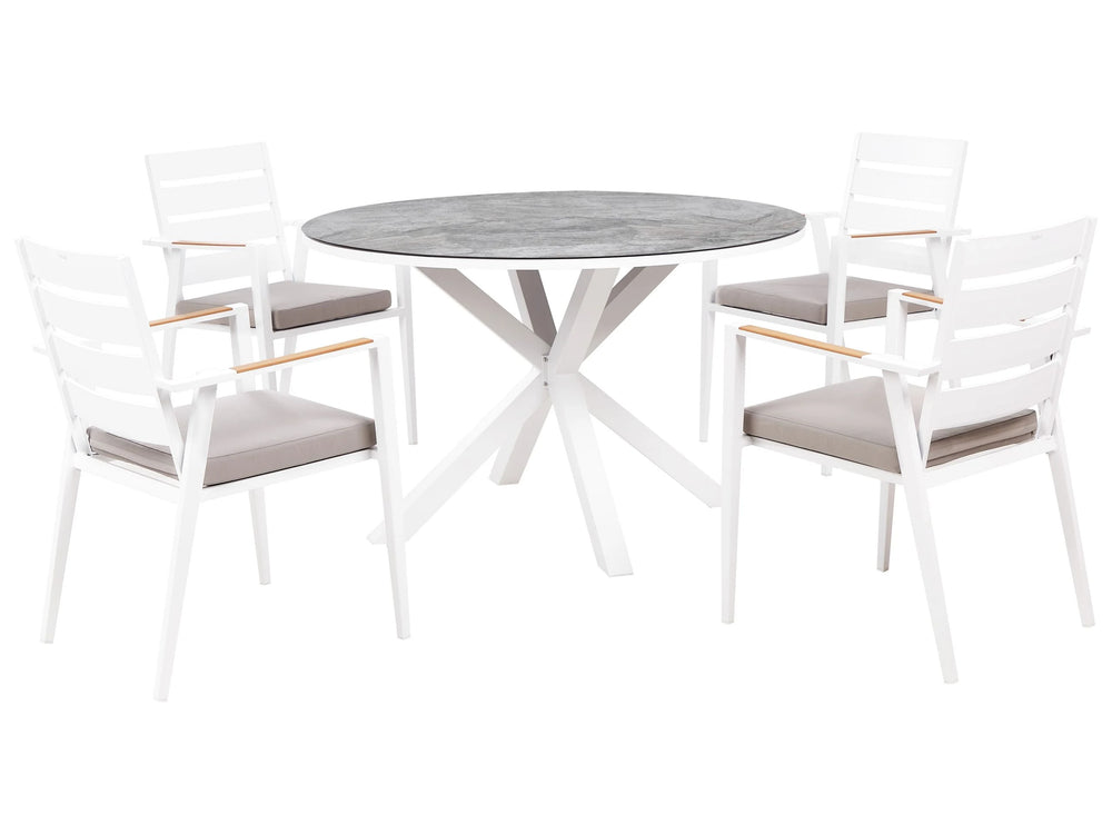 4 Seater Garden Dining Set White Aluminium Round Table with Marble Effect Ceramic Glass Top Slatted Chairs with Grey Seat Pad Cushions Beliani