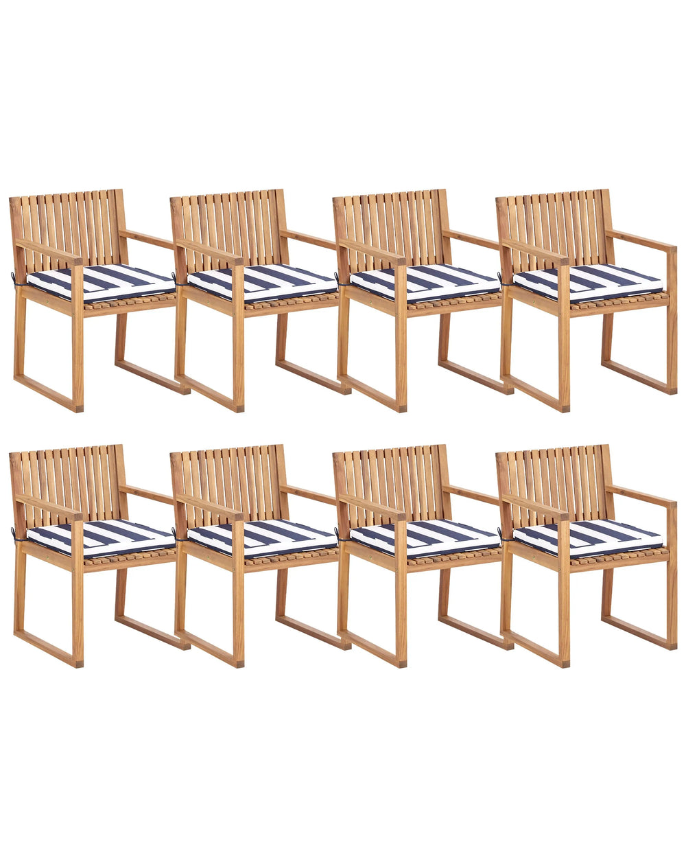 Set of 8 Garden Dining Chairs Light Certified Acacia Wood with Navy Blue and White Cushions 54 x 59 x 80 cm Rustic Style Beliani