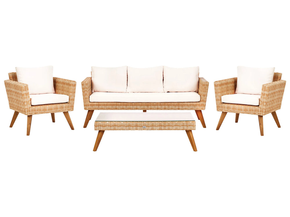 Patio Set Light PE Rattan 3 Seater 2 Chairs Off-White Cushions Coffee Table Outdoor Country Beliani