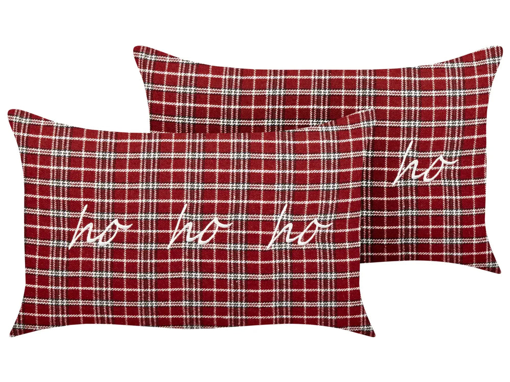 Set of 2 Scatter Cushions Red Polyester Fabric Christmas Caption Tartan Pattern 30 x 50 cm Decoration Accessory Beliani is backordered and will ship as soon as it is back in stock.