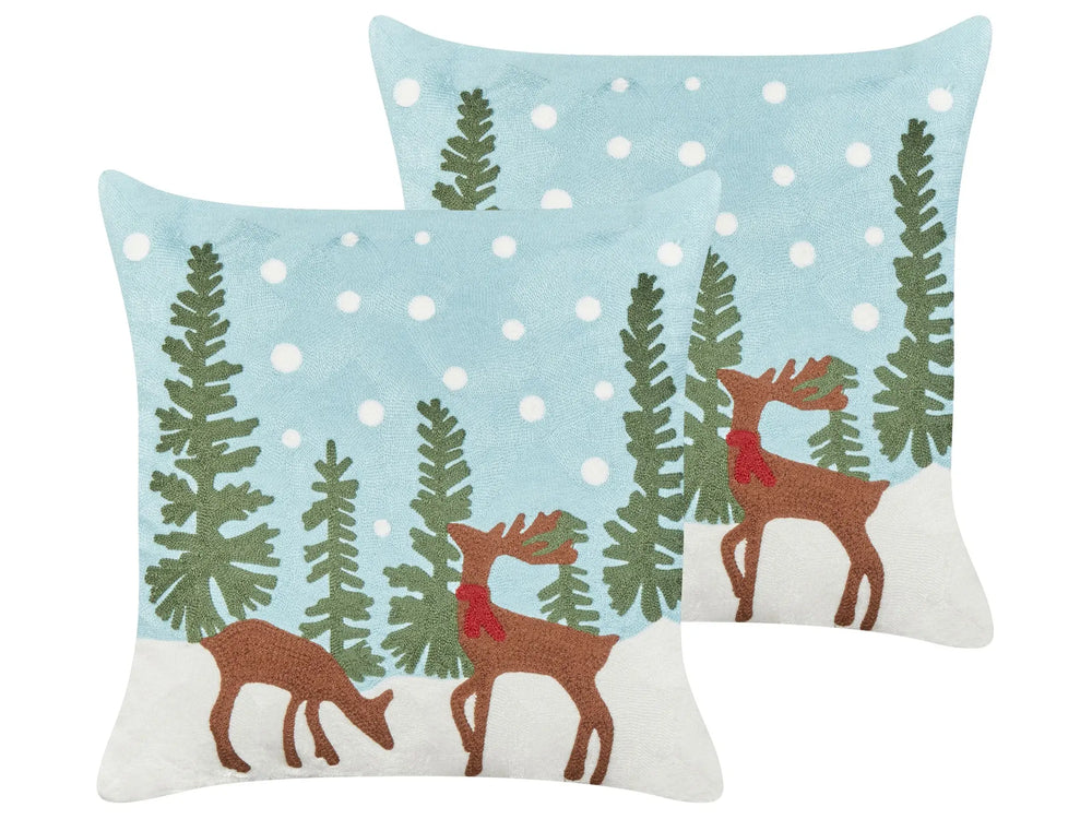 Set of 2 Scatter Cushions Light Blue Cotton Fabric Christmas Motif Deer Pattern 45 x 45 cm Decoration Accessory Beliani
