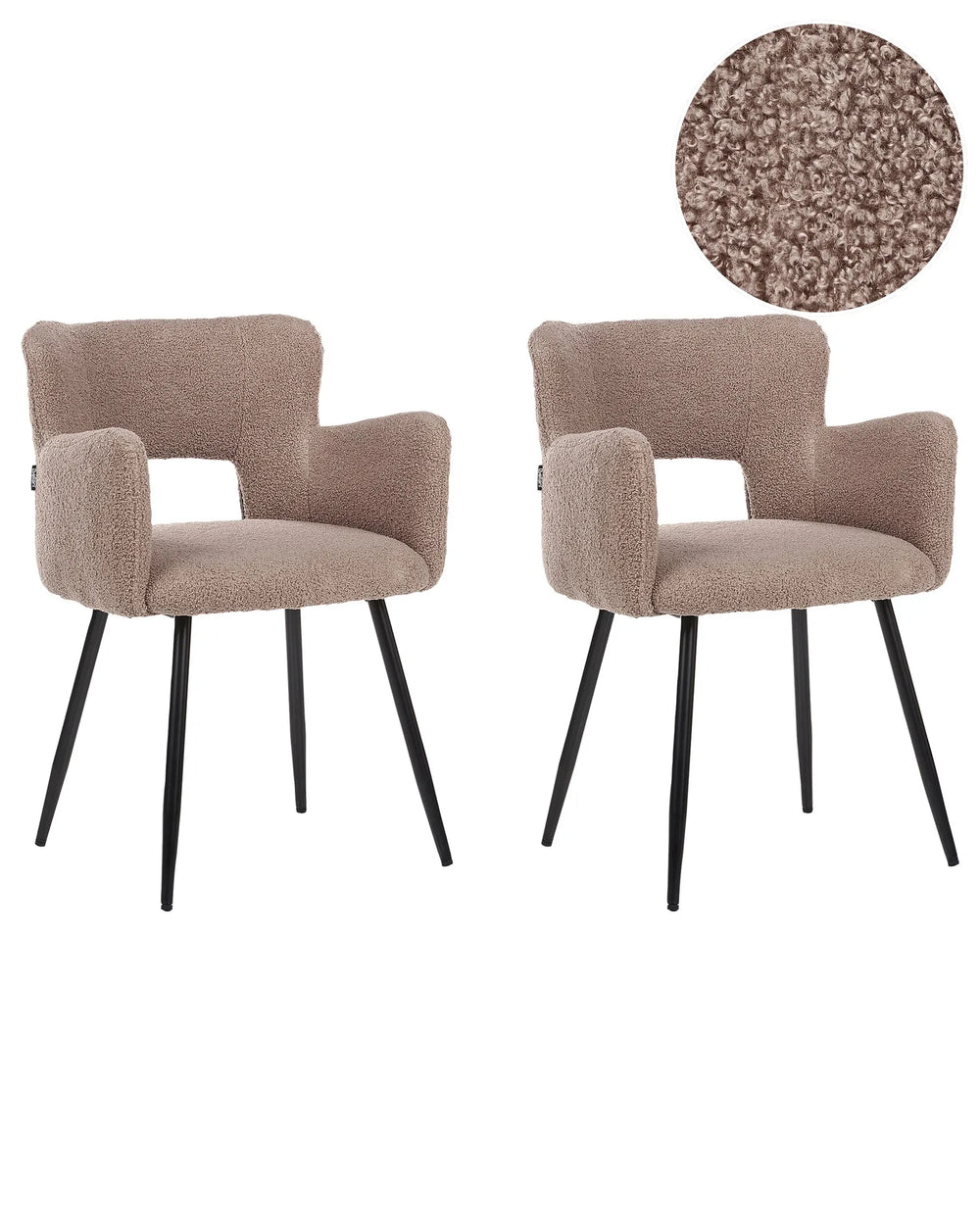 Set of 2 Chairs Dining Chair Brown Teddy Boucle with Armrests Cut-Out Backrest Black Metal Legs Beliani is backordered and will ship as soon as it is back in stock.