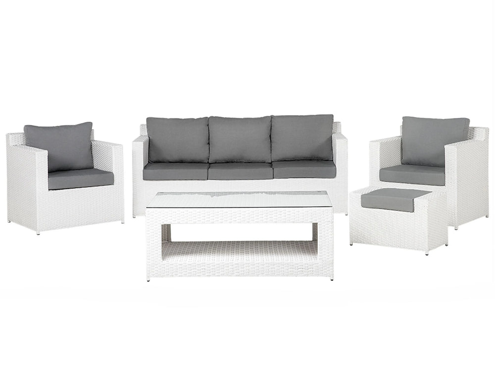 Garden Corner Sofa Set White Faux Rattan Grey Cushions 6 Seater with Table Ottoman Outdoor Scandinavian Modern Wicker Conversation Set Beliani is backordered and will ship as soon as it is back in stock.