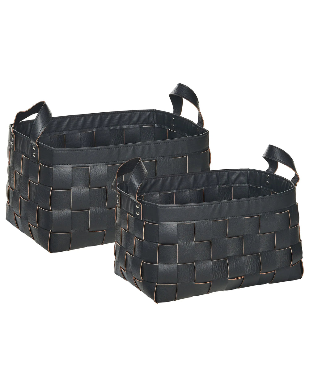 Set of 2 Storage Baskets Black Faux Leather Handmade with Handles Shelving Box Retro Design Beliani