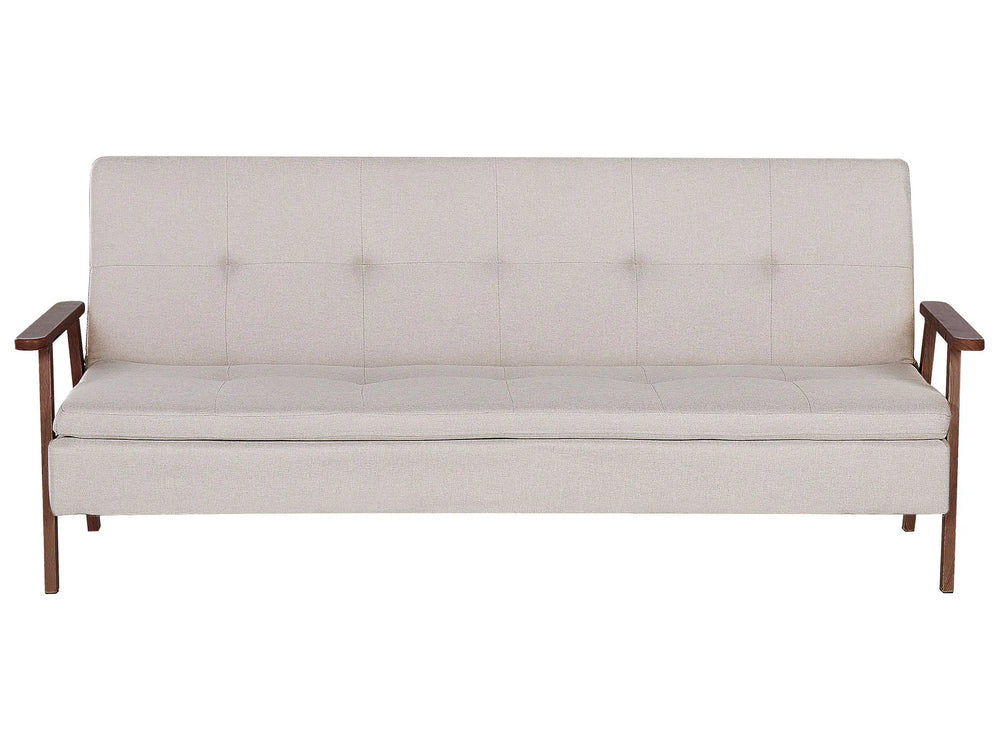 Sofa Bed Beige Fabric wirh Dark Wood Armrests Upholstered 3 Seater Click Clack Bed Wooden Frame Beliani