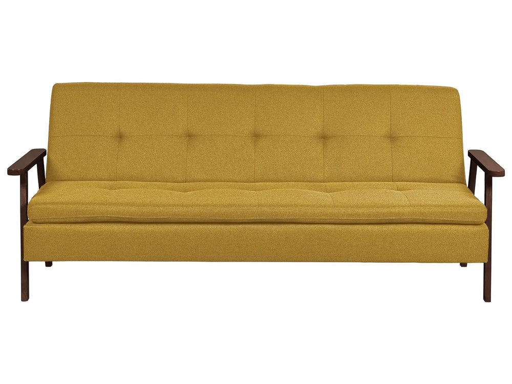 Sofa Bed Mustard Fabric wirh Dark Wood Armrests Upholstered 3 Seater Click Clack Bed Wooden Frame Beliani is backordered and will ship as soon as it is back in stock.