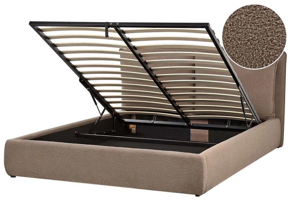 EU King Size Ottoman Bed Brown Boucle Fabric 5ft3 Upholstered Frame Cushion Back Storage Cosy Bedroom Modern Beliani