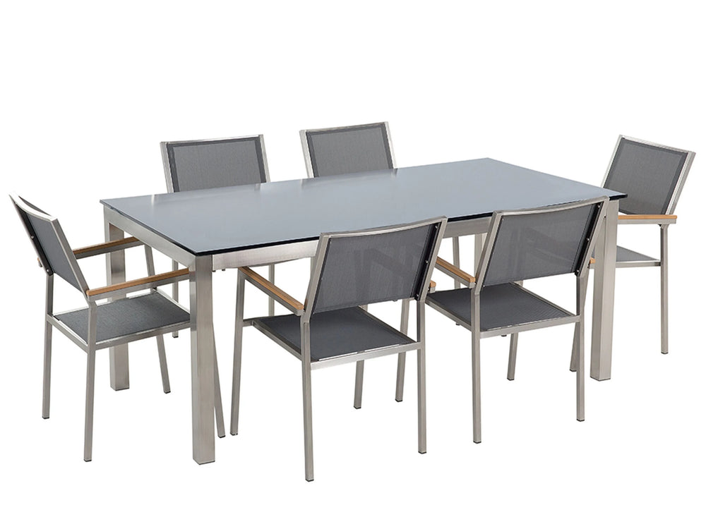 Garden Dining Set Grey with Black Glass Table Top 6 Seats 180 x 90 cm Beliani