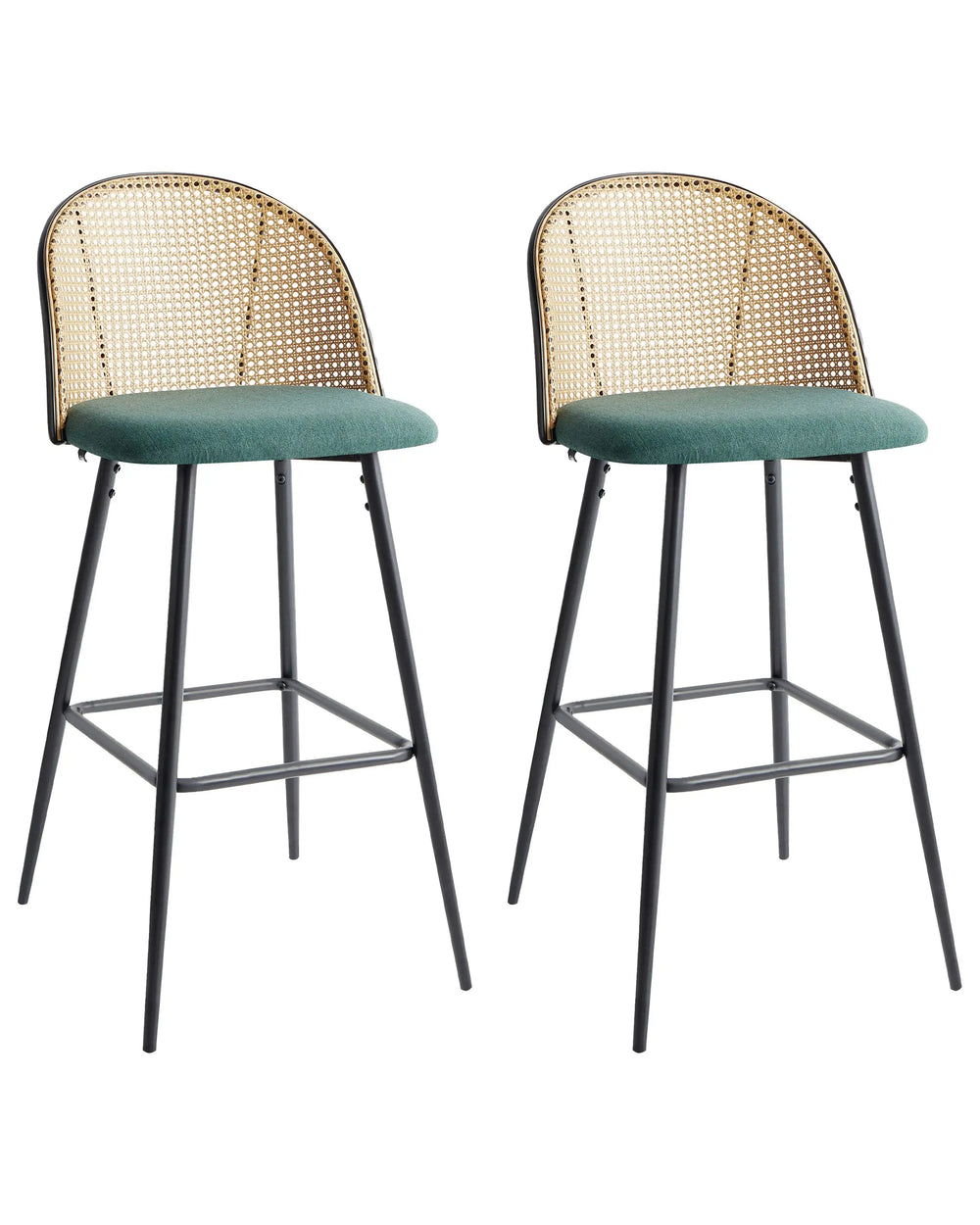Set of 2 Bar Chairs Green Fabric Seat Metal Black Frame Viennese Braid Backrest Retro Seating Beliani is backordered and will ship as soon as it is back in stock.