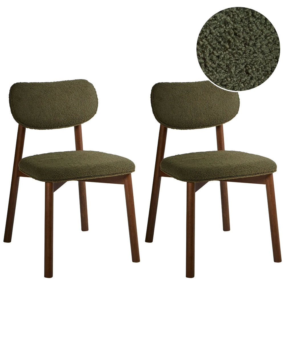 Set of 2 Dining Chairs Dark Brown and Green Boucle Rubber Wood Frame Upholstered Seat and Backrest Dining Room Kitchen Beliani